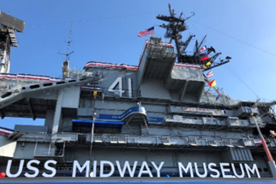 Tàu sân bay USS Midway- có hải trình phục vụ 47 năm, là mẫu hạm phục vụ lâu nhất của quân đội Mỹ trong thế kỷ 20, từ cuối chiến tranh TG II cho đến cuộc chiến giải phóng Kuwait 1991, trước khi "về hưu" vào năm 1992. (Tham quan chụp hình bên ngoài).