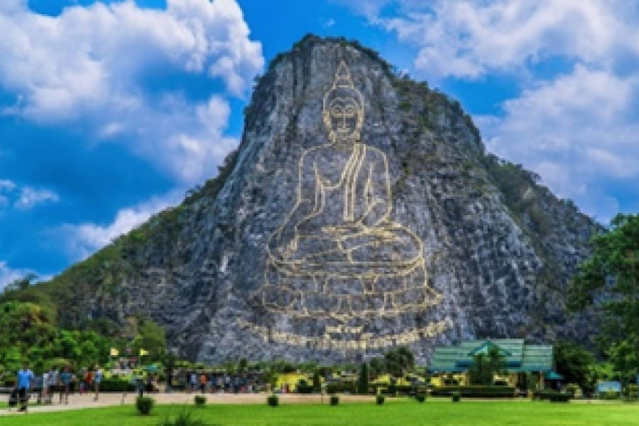Khao Chee Chan - Trân Bảo Phật Sơn- tượng Phật Thích Ca Mâu Ni đang ngồi thiền- được tạc trên một vách núi giữa trời. Sự độc đáo của bức tượng Phật lớn này là được khắc nổi bằng vàng ròng 24k, cao 130 m, rộng hơn 70m, được xây dựng vào năm 1996.