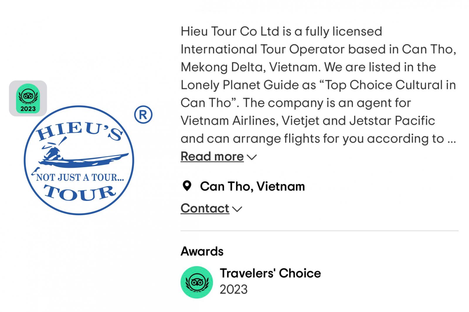 From 2016 to 2020, Hieutour VN Investment Co., Ltd was honored in famous travel books such as Lonely Planet and Rough Guides from the United Kingdom. It was also voted as the most reputable tour organizer in the Mekong Delta region and the whole country by the renowned US travel website, TripAdvisor.com. The company is also an authorized agent for domestic airlines such as Vietnam Airlines, Vietjet Air, Bamboo Airways, and has strategic partnerships with various suppliers ranging from restaurants, hotels to transportation service providers across the country and abroad.