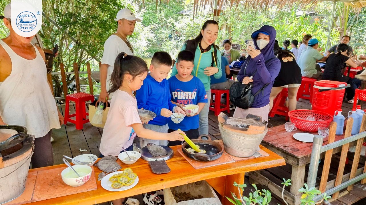 Sau đó đoàn tham gia chương trình làm bánh dân gian, tự tay làm và thưởng thức món bánh giản dị mà đậm chất quê hương chọn 1 trong các loại bánh sau: kẹp cuốn/kẹp trái tim/ướt ngọt/bánh in, khọt, bánh chuối hấp, bánh lá mít hoặc bánh bèo ngọt…
