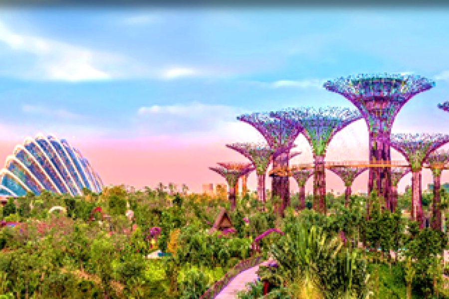 Gardens by the Bay - khu vườn nhân tạo rộng hơn 100 ha, có hơn 250.000 loài thực vật Qúy hiếm, với các “siêu cây” khổng lồ lấy năng lượng mặt trời vào ban ngày và tự tỏa sáng vào ban đêm. Từ đây Quý khách có thể chụp hình toàn cảnh “Chiếc du thuyền” nằm ở độ cao 200m nối liền 3 đỉnh của 3 tòa tháp khách sạn Marina Bay Sands. (Chụp hình bên ngoài).