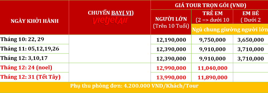 Phụ thu phòng đơn 4.200.000VND/Khách/Tour