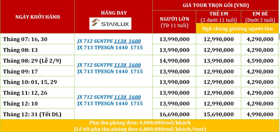 08:30: Quý khách tập trung tại sân bay Quốc tế Tân Sơn Nhất, làm thủ tục chuyến bay đi Đài Loan, chuyến bay dự kiến: JX 712 SGNTPE 1130 1600.